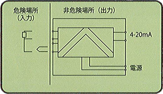 絶縁型バリア(単独でのA種接地が不要、特別危険箇所で使用する本安機器には絶縁型バリアを推奨※)。入力、出力、電源間が絶縁され、グランドループを防止。厚さ12.5mmの薄型ケースを使用。本安パラメータの合う任意の本安機器と接続可能。コネクタ端子採用によりメンテナンスが容易。
